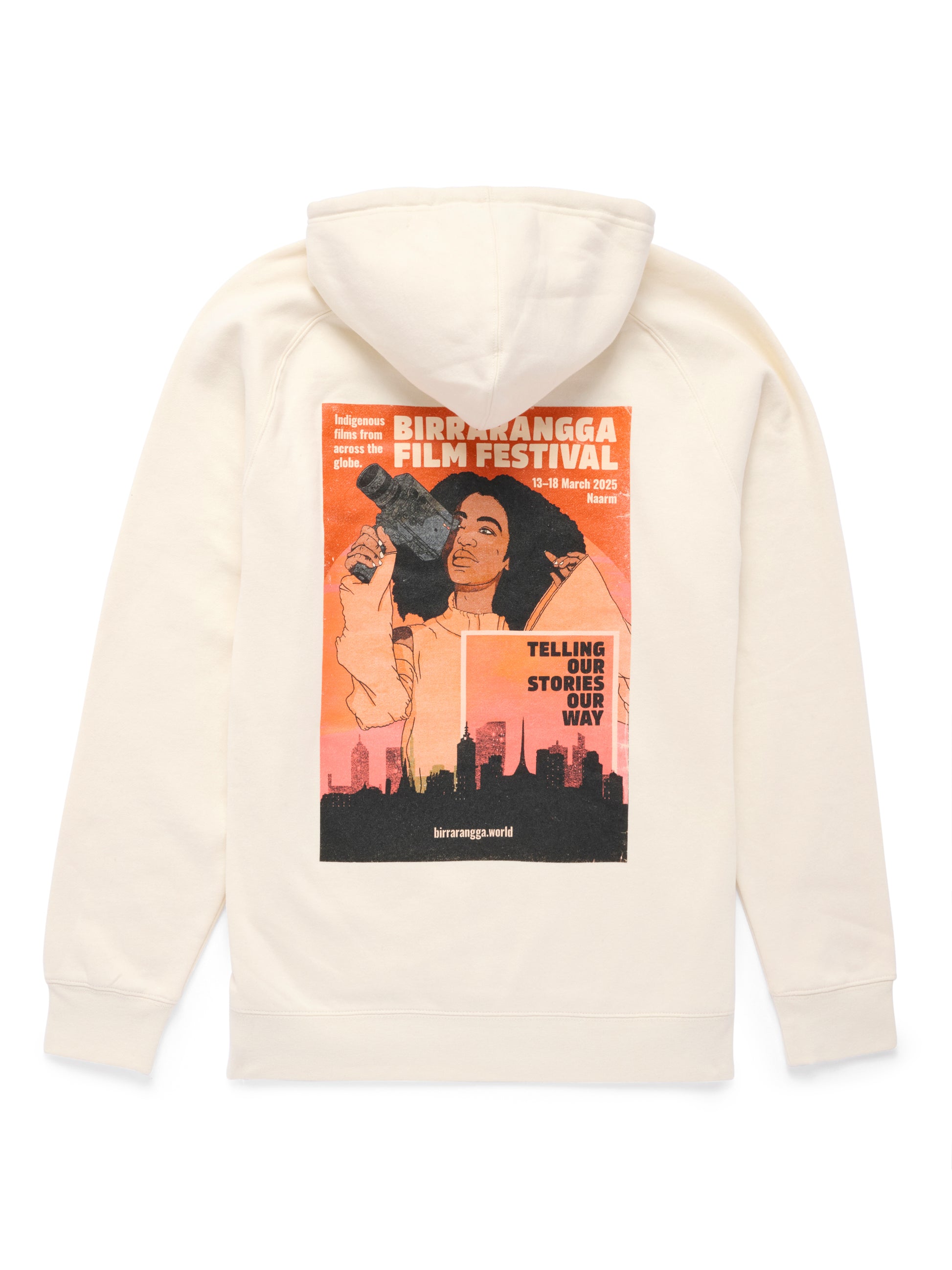 Cream Hoody with festival artwork by Oumoula Mackenzie.